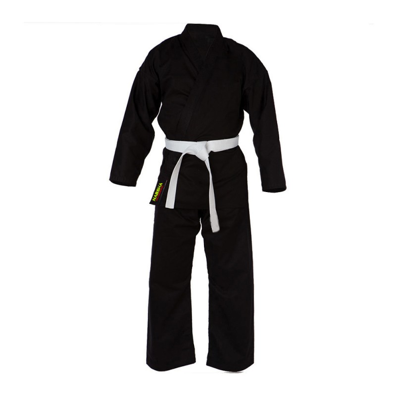 with inside ties for a secure fit Elastic drawstring waist 65% cotton.35% polyester 8 to 10oz fabric also available in 100% cotton canvas 12 to 16oz.Reinforced stitching at seams provides strength for even the most strenuous workouts Set includes jacket, pants with or without white belt Machine washable.Side vents with tie cords.Pant crotch gusset with triangular inseam Elastic drawstring waist band.Available in many colors.